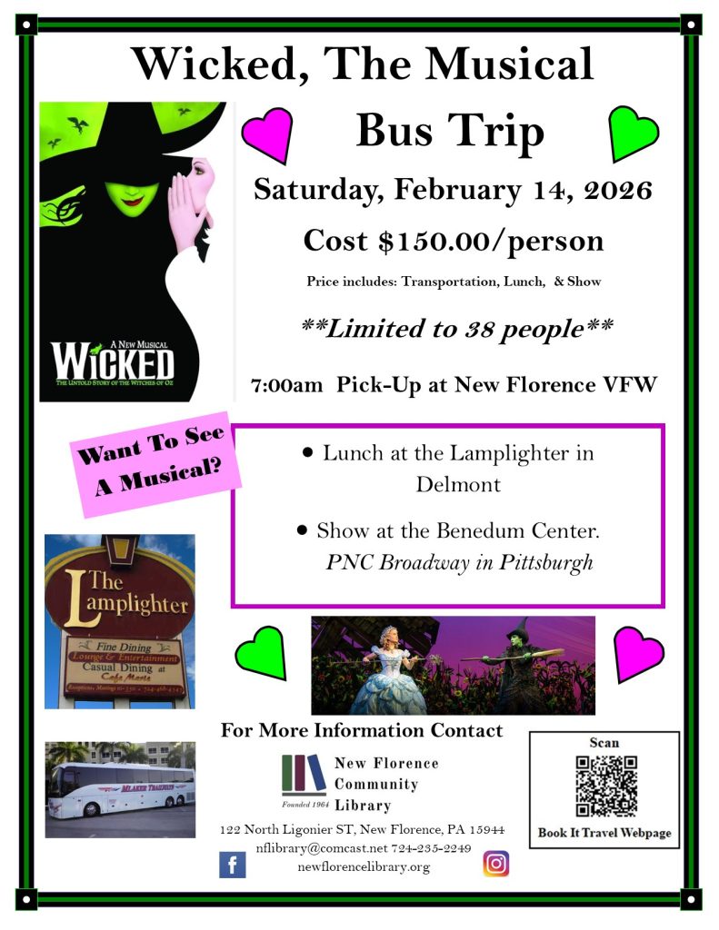 Please stop by the Library to drop off your payment (cash or check) or mail a check to: The New Florence Community Library, 122 North Ligonier ST, New Florence, PA 15944. Your payment ensures your seat. Sorry NO pick-up in Ligonier.