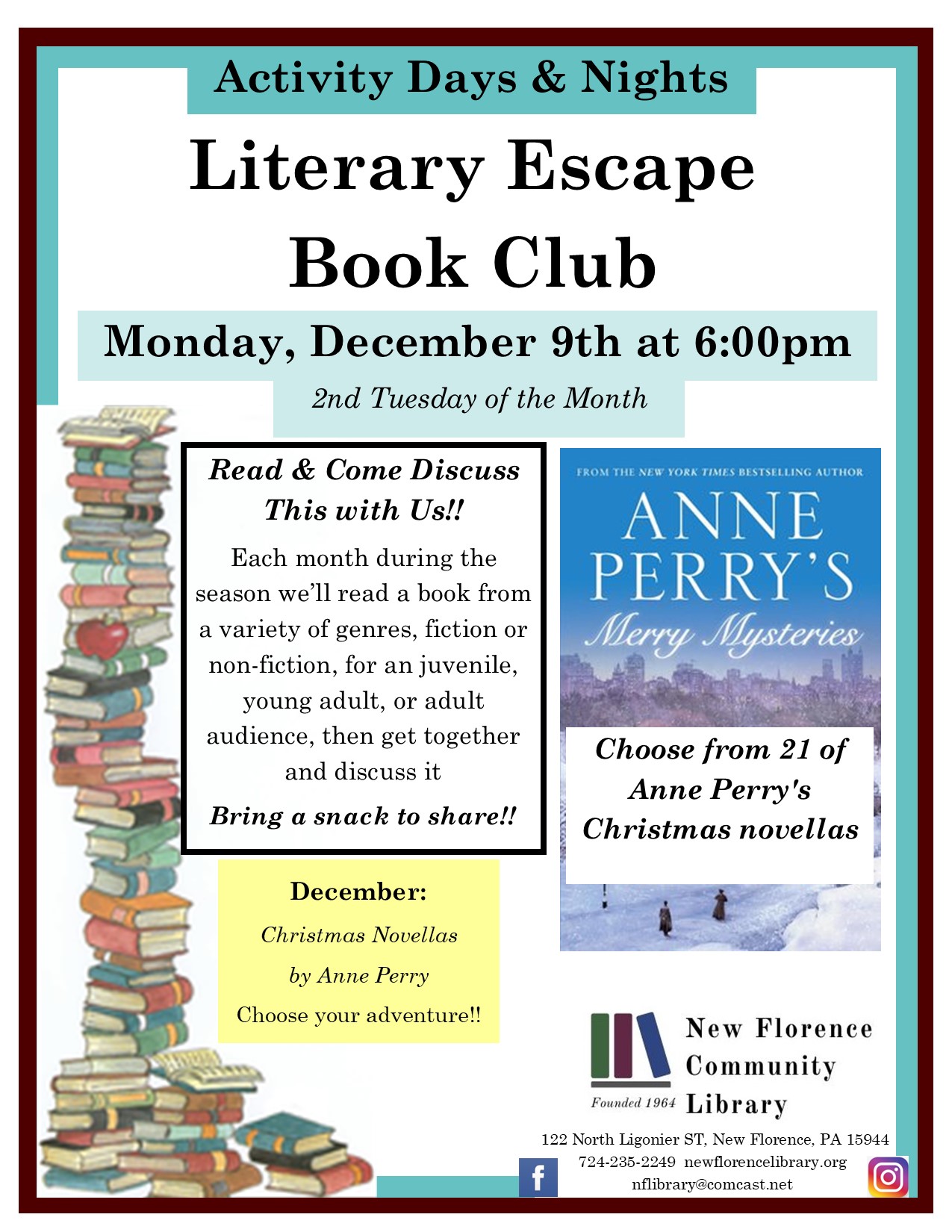 The New Florence Community’s Literary Escape Book Club Comes meets next on December 9th at 6:00pm (the 2nd Tuesday). Join us in reading and discussing a book chosen by the library staff and participants of the group. Bring a snack to share!