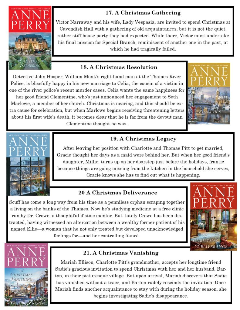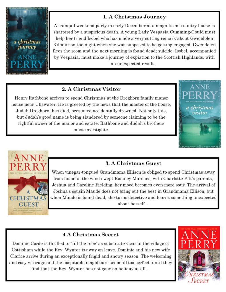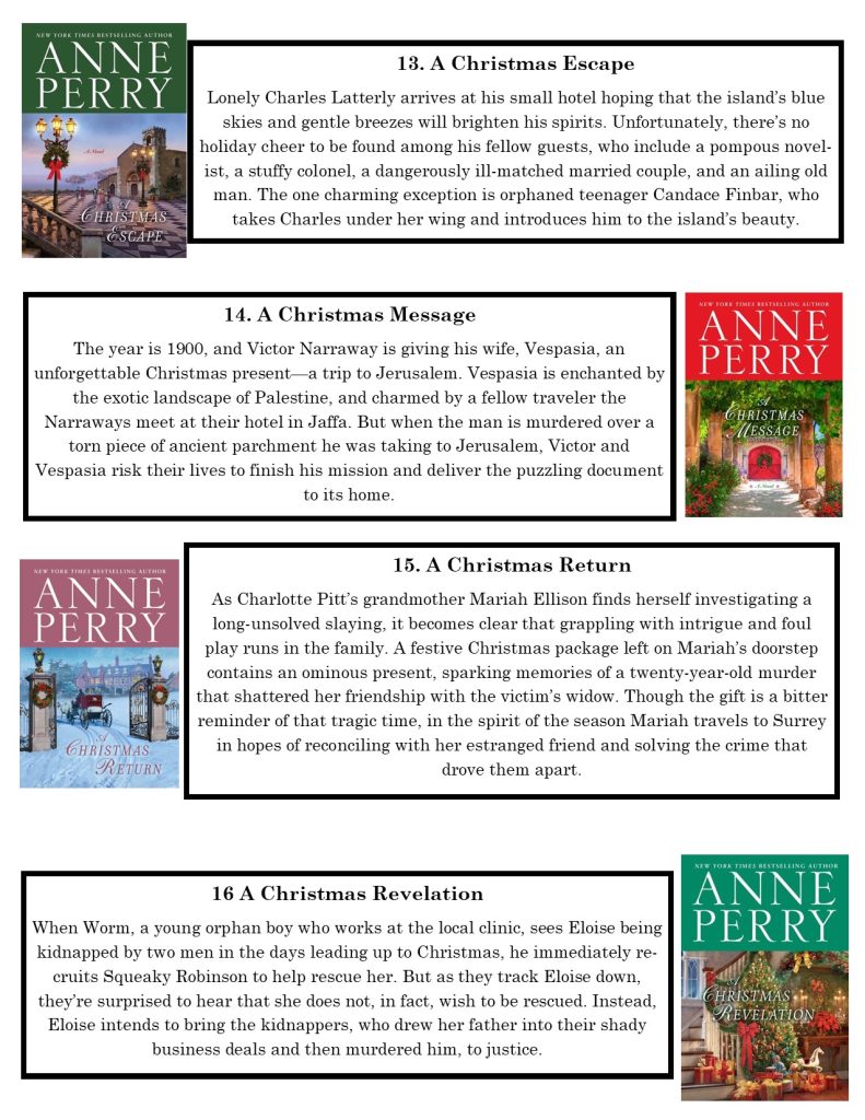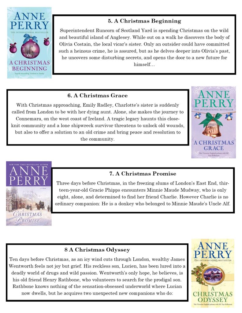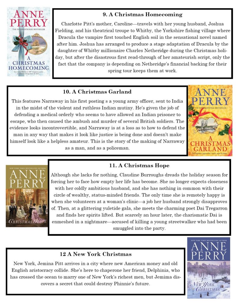 For December we are doing things a little different. Anne Perry has a series of Christmas novellas. These are short and related to her Victorian era novels. Each one happens just before Christmas. They have various settings, a crime to be solved, and a resolution and happy ending just as the church bells ring at midnight on Christmas morning.