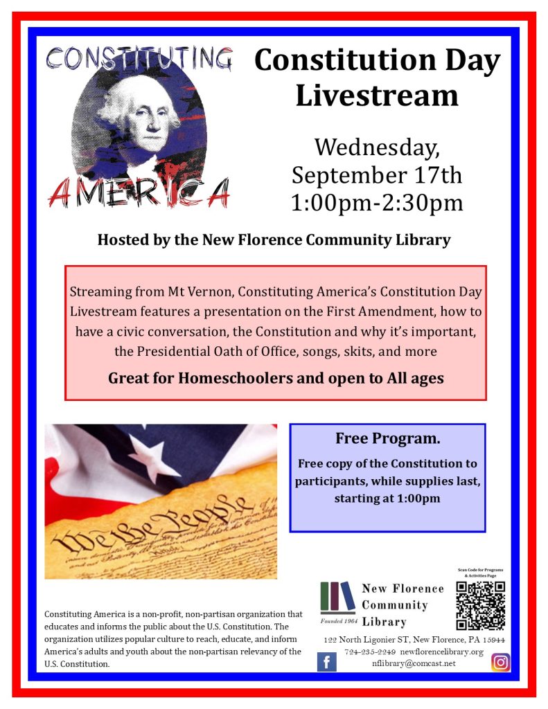 Join us for a FREE program streaming from George Washington’s Mount Vernon. Constituting America’s program will feature a presentation on the First Amendment, how to have a civic conversation, the Constitution and why it’s important, the Presidential Oath of Office, songs, skits, and more.