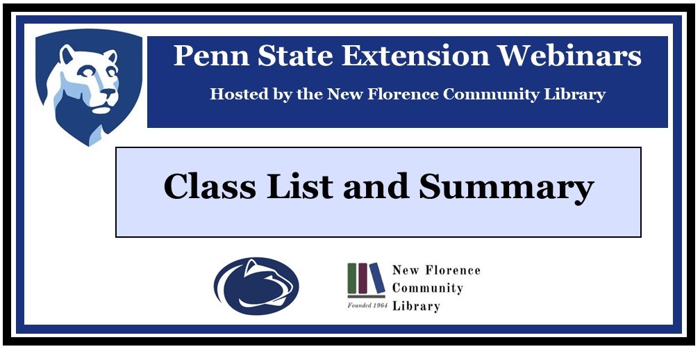 Listed below are the upcoming webinars from the Penn State Extension. All FREE Webinars are used with permission from the Penn State Extension Office and are offered for educational purposes. Some information may not be appropriate for children. Parental guidance is encouraged. Views and opinions expressed in the webinars are those of the speakers/educators and do not necessarily reflect those of the New Florence Community Library. During live sessions there may be opportunities to ask questions and/or chat.