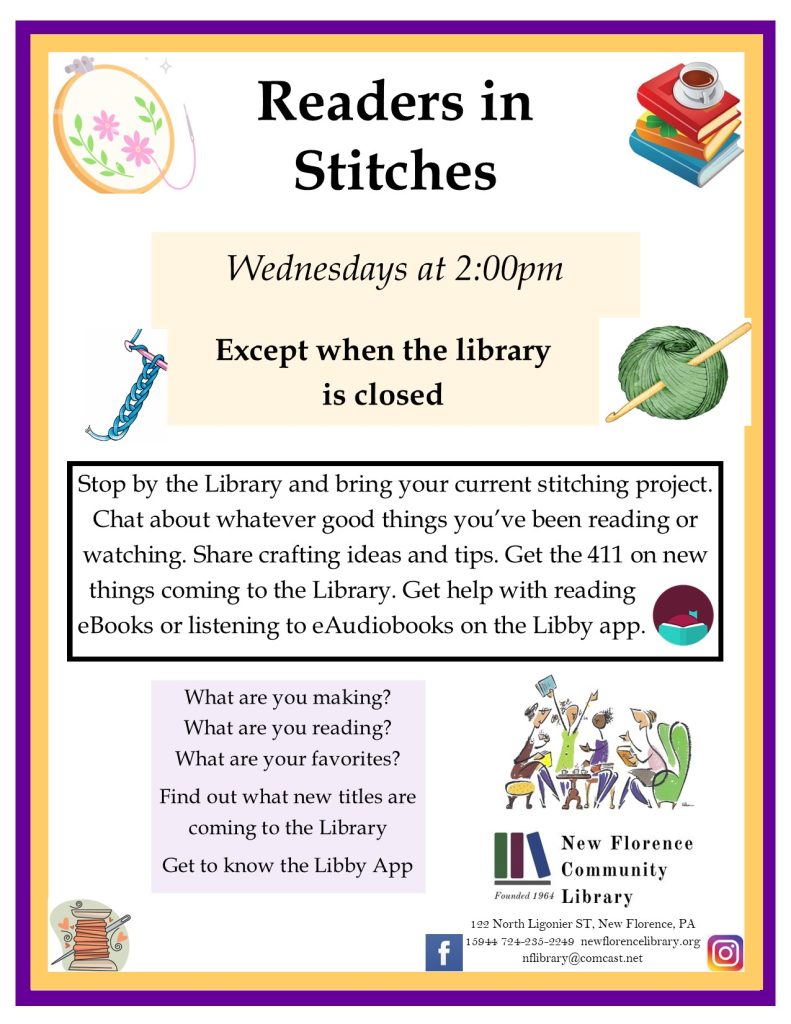 Readers in Stitches meets every Wednesday (except for when the library is closed). Not a Book Club or a Craft Class. Come and bring whatever you’re stitching, knitting, crocheting, etc. Talk about what you’re reading or watching, and what you’re making. Get the 411 on new stuff coming into the library and get help with reading e-books or listening to e-audiobooks on the Libby app.